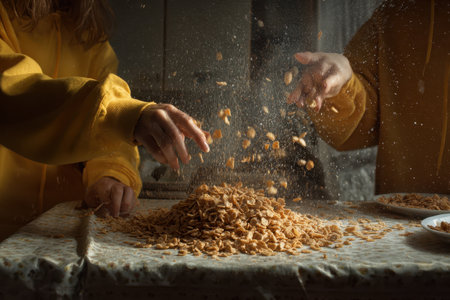 Kids enthusiastically tossing cereal onto the table in a bright kitchen during a playful breakfast moment