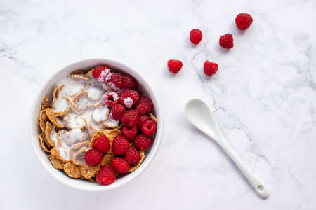 Bowl of multigrain cereal with yogurt and fresh raspberry berries on marble table background. Healthy diet breakfast. Top view, flat lay, copy space