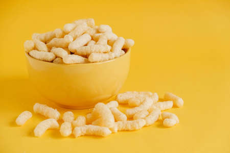 Corn sticks in a yellow bowl on a yellow background. Copy, empty space for text.