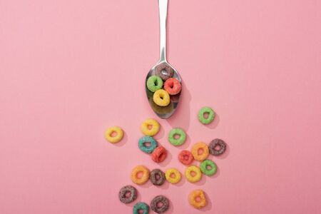 top view of bright colorful breakfast cereal scattered from spoon on pink background