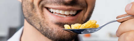 cropped view of happy man holding spoon with corn flakes, banner