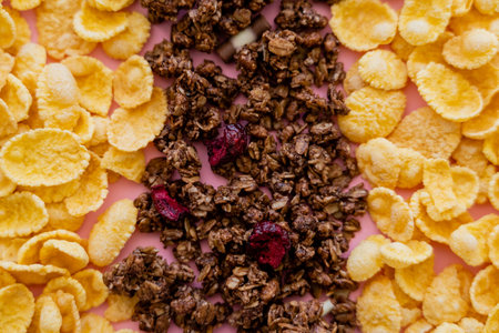 close up view of crispy corn flakes and tasty granola on pink