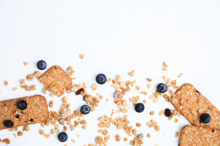 Crunchy muesli cookies and blueberries, Breakfast cereals isolated on white background, selective focus, top view.