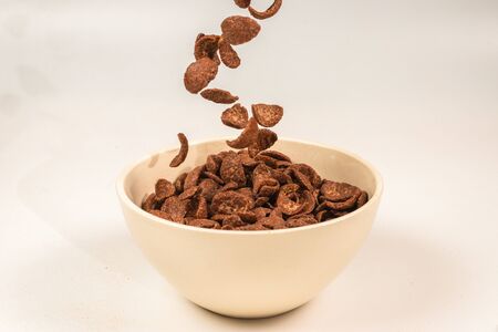 Chocolate corn flakes falling to the white bowl isolated on white. Motion. Copyspace.