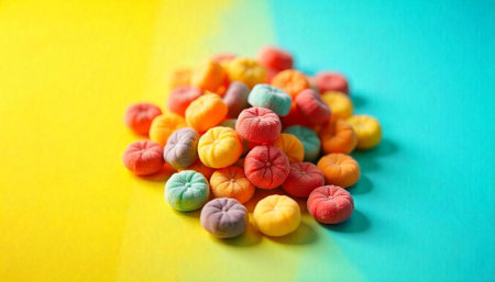 Colorful candy pumpkins on vibrant yellow and blue background