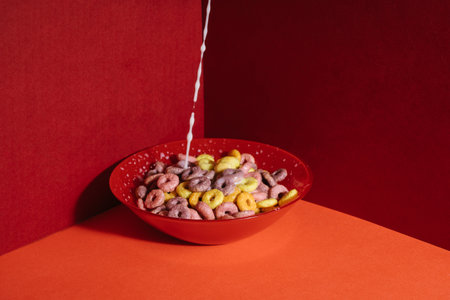 A closeup shot of colourful cereals in a red bowl with milk pouring into it on red corner background
