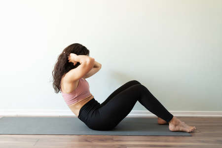 Profile view of a fit young woman with curly hair doing sit up exercises for her home workout