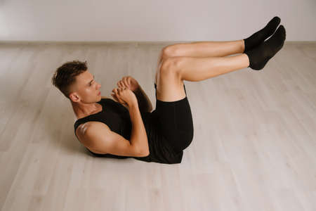 A strong, healthy man with muscles, training at home. Exercises for the muscles of the press.