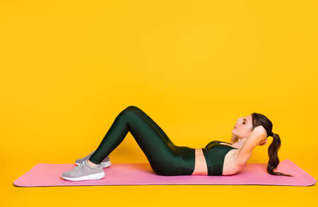 Profile side full body view of nice thin slender focused girl lying on mat doing crunches isolated on bright yellow color background