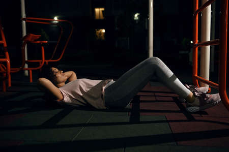 Sportswoman lying on the sports ground and performing crunches exercise while working out at the evening. Sport, active and healthy lifestyle concept