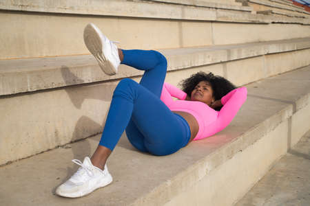 African-American woman with afro hair and sportswear, with fluorescent pink t-shirt and leggings, doing sit-ups on some stairs outdoors. Fitness concept, sport, street, urban.