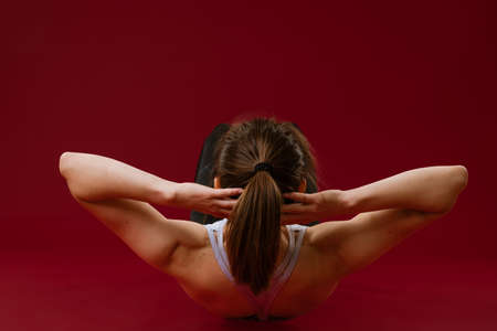 Caucasian ethnicity woman goes in for sports in sportswear doing abs exercise on red background