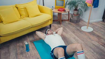 Sportsman doing abs on fitness mat in living room, retro sport concept