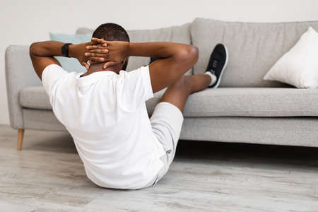 Workout At Home. Black Guy Doing Abs Crunches With Legs On Sofa Exercising Back To Camera In Living Room Indoors. Fitness Lifestyle And Sport Concept. Back-View