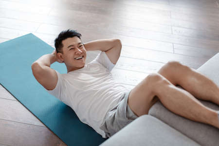 Asian male doing exercise at home to stay healthy on new normal lifestyle, indoor home workout concept, core abs abdominals training
