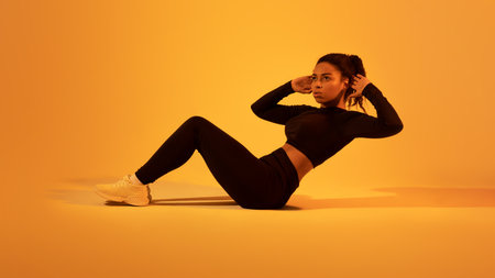 Young african american woman doing abs exercises on orange neon light studio background, panorama, free space