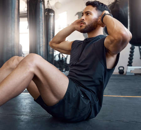Put all your focus into it. Shot of a sporty young man doing sit up exercises in a gym.