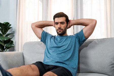 Athletic body and active sporty man using furniture for effective targeting muscle gain exercise at gaiety home exercise as concept of healthy fit body home workout lifestyle.