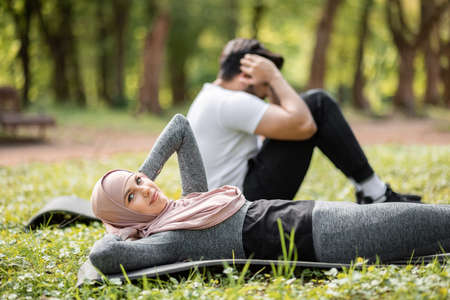 Strong young man and woman in sport clothes lying on yoga mat and doing abs exercises. Muslim couple training together on fresh air. Active lifestyles.