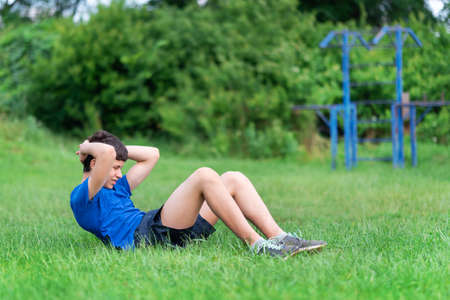 Young man making abdominal exercises on the ground. Fitness, workout and training at park.