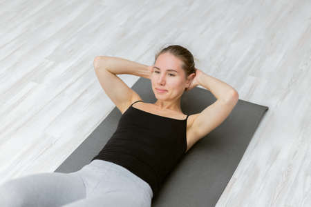 Young attractive fit woman trains abdominal muscles while lying on the mat and doing crunches on the floor