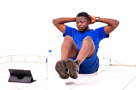 portrait of a young athletic man in sportswear doing abdominal exercises using a digital tablet.