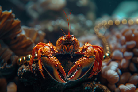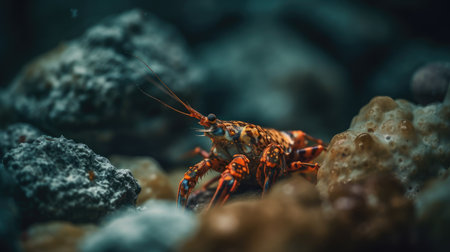 A vibrant lobster displaying intricate colors, captured in its natural underwater habitat. This close-up shot highlights its unique features and marine environment, showcasing the beauty of ocean biodiversity.
