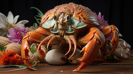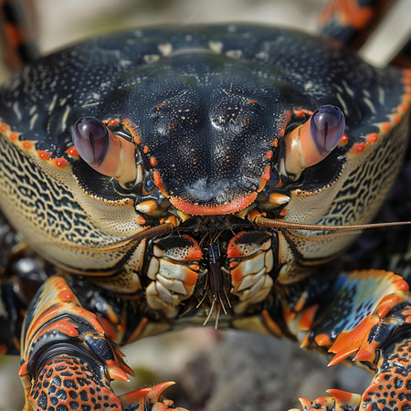 A stunning close-up of a vibrant crab with intricate textures and vivid colors, captured in sharp detail.