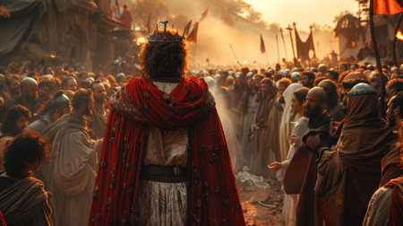 A majestic medieval king stands before a large crowd, surrounded by a rich, warm sunset atmosphere, evoking themes of leadership and historical grandeur.