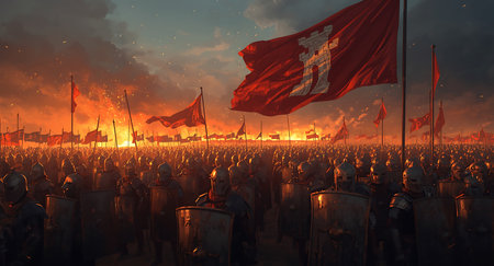 Medieval knights army standing with red flags and shields on the battle field at sunset.