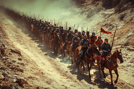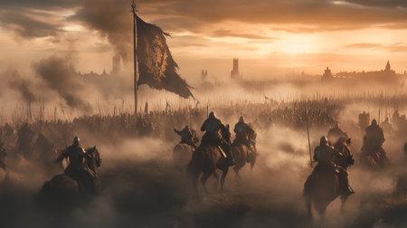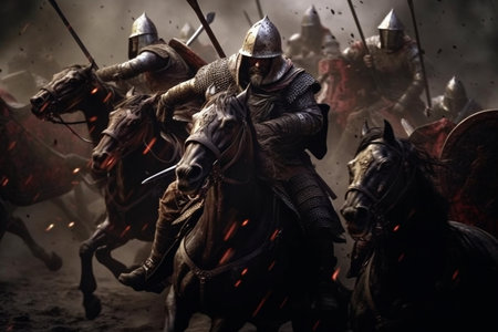 Medieval battle scene with cavalry and infantry with AI generated.