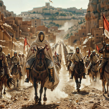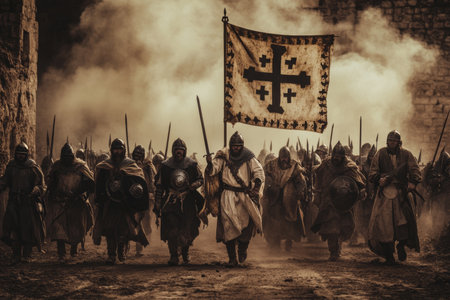 Crusaders marching under cross banner a visual representation of religious warfare history
