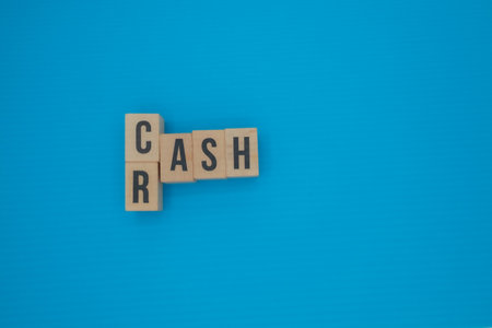Wooden blocks forming the words CASH on blue background, contrast between economy and health issue.