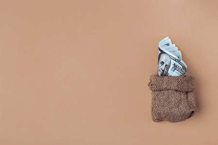 Roll of one hundred dollar bills in a burlap sack on a beige background. Copy space