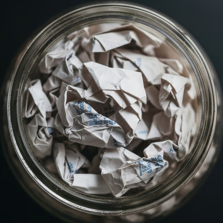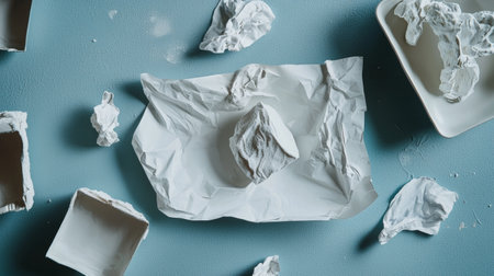 A creative composition of crumpled white papers scattered on a pastel blue background, emphasizing texture and minimalism.
