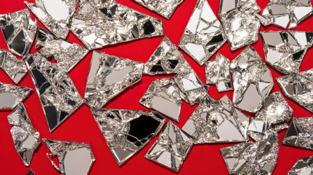 A collection of shattered mirror fragments scattered on a vibrant red background, creating a striking and dynamic visual effect, ideal for artistic projects.