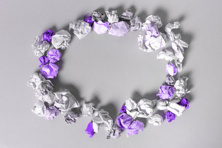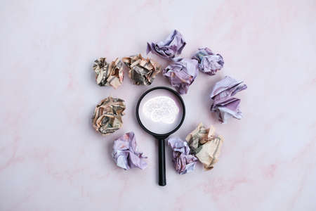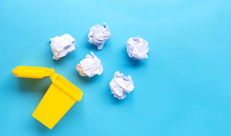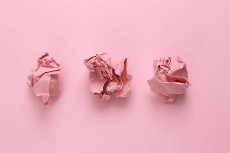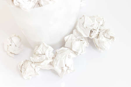 Wasted ideas. Flat lay of crumpled paper ball pile on white surface. Abstract background. Copy space.