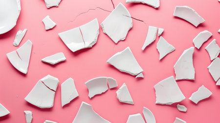 Pieces of broken ceramic plate on pink background, flat lay. Space for text
