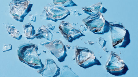 Clear shards of glass laid broken on a smooth light blue surface. The sunlight gleams off the sharp edges creating intricate reflections and highlights in the shards.
