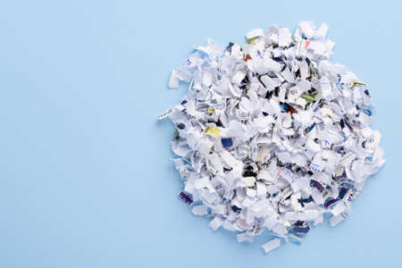 Heap of cross cut shredded documents on blue background top view with copy-space