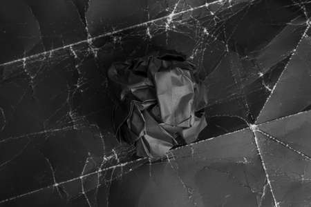 On black wrinkled old paper, a crumpled black ball. close-up. Black on black