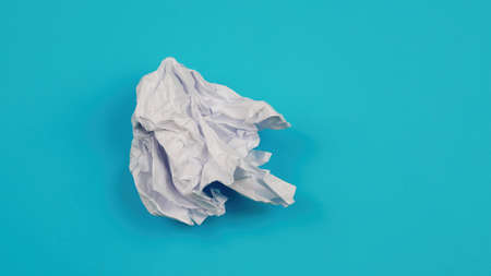 Crumpled and torn pieces of paper on a light turquoise background. Three balls of paper and two crumpled paper pieces. The basis for a variety of design tasks. Close-up. Selective focus.