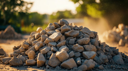 A close-up view of a pile of crushed stone at a construction site, surrounded by nature. Dust particles float in the air, highlighting the vibrant sunset backdrop.