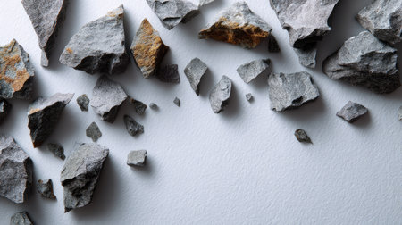 Shattered basalt rock pieces over white paper texture background, styled as an abstract layout