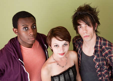 Three teens in urban clothing look up at the camera in front of a green studio wall.