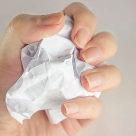 A hand clenched into a fist holding crushed, crumpled sheet of white paper isolated on white, recycling or fail creativity concept