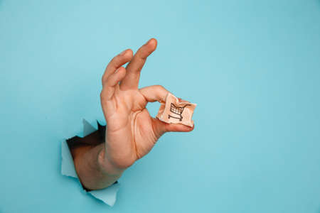 Hand with a small broken delivery box through a blue paper hole. Shipments accident