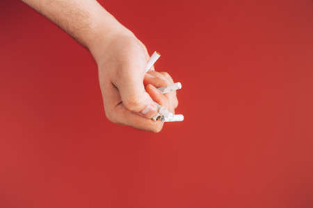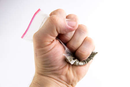 prohibition of semi-legal smoking mixtures: a bag with synthetic marijuana called spice is compressed in a man's fist, on a light background