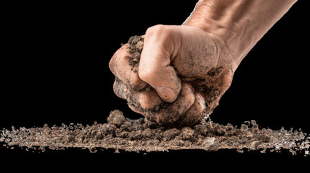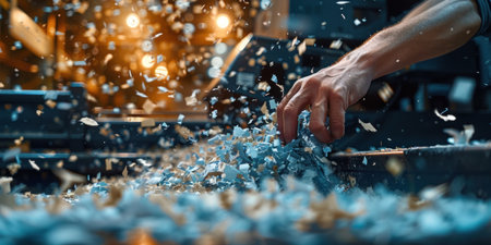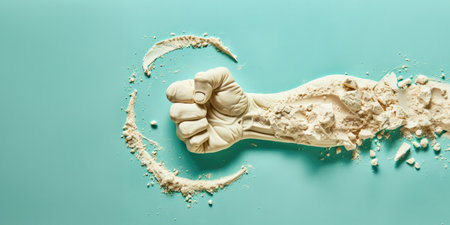 A close-up view of a human fist clenched tightly, demonstrating immense power as it shatters a material, creating a dynamic explosion of fragments.