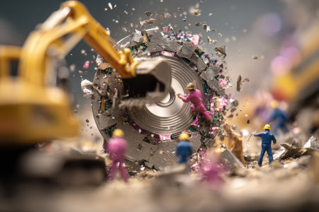 This image presents a miniature construction scene featuring a yellow excavator and several worker figures. The scene highlights a metallic, circular object being dismantled. The composition, lit by bright, diffused lighting, creates a surreal environment. Suitable for conceptual illustrations, the image could be used in diverse commercial projects, including editorial applications.